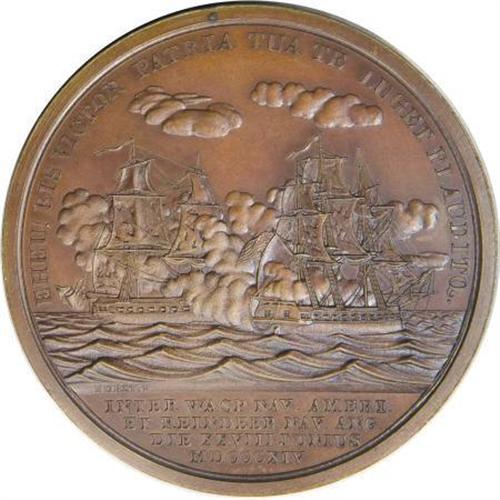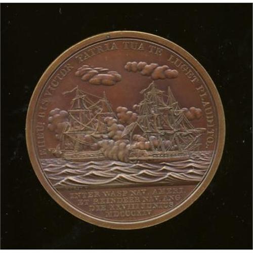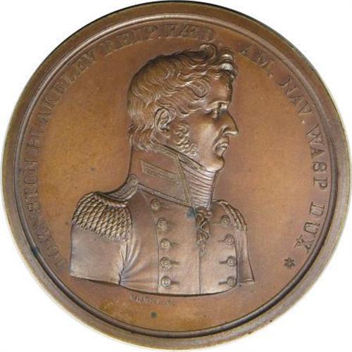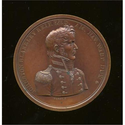 <B>Captain Johnston Blakely Naval Medal, Julian-NA-6, MS64 NGC.</B></I> Bronzed copper, 65 mm, 133.0 gm. Dies by Moritz Furst. Obverse bust right, legend around JOHNSTON BLAKELY REIP. FAED. AM. NAV. WASP DUX ("Johnston Blakely, captain of the American federal republic ship <I>Wasp</B></I>"). FURST.F. below. Reverse EHEU! BIS VICTOR PATRIA TUA TE LUGET PLAUDITQ. ("Alas! Twice conqueror, your country grieves and applauds thee") around, naval battle scene in center, in exergue INTER WASP NAV. AMERI. ET REINDEER NAV. ANG. DIE XXVIII JUNIUS MDCCCXIV ("Between the American ship <I>Wasp</B></I> and the English vessel <I>Reindeer, </B></I>June 28, 1814"). FURST.F. at left.<BR> This Choice Uncirculated piece offers rich cherry and mahogany tones on both sides, with radiant luster and minimal carbon present. Accompanied by an NGC Photo Certificate. A similar example in a 1991 Stack's sale, lot 28, realized $200.<BR><BR><b>Shipping:</b> Coins & Currency (<a target="_blank" href="http://www.heritageauctions.com/common/shipping.php">view shipping information</a>)