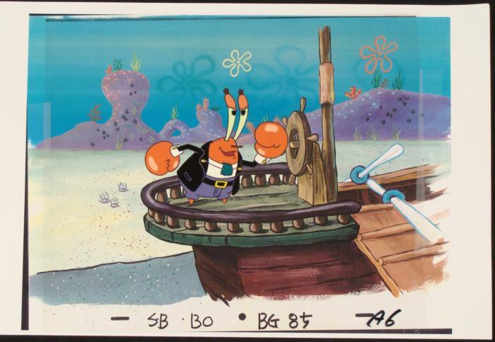 This animation cel and reproduction background are from the Nickelodeon TV show SpongeBob Squarepants. The story takes place under the deep blue sea in Bikini Bottom, where SpongeBob resides. SpongeBob, who is a yellow, porous sponge, is your typical happy-go-lucky character, as he is always cheerful and enjoys making people laugh. Patrick Star, SpongeBob's neighbor who is a starfish, is your average children's show idiot, as he boasts knowing nothing and is often getting himself into ridiculous situations. Between the homes of these two lies the home of the miserable Squidward, a squid, who is known for being grouchy and playing tricks on SpongeBob and Patrick. Both SpongeBob and Squidward work at the Krusty Krab, a fast food business run by the greedy money-loving Mr. Krabs, a crab, the arch rival of the evil, possibly misunderstood, Plankton. Another neighbor, Sandy Cheeks, an athletic squirrel who normally wears an astronaut's space suit, was introduced in "Tea at the Treedome." She spends most of her time inventing and experimenting. Why is Mr. Krabs captain of the ship?Original Printed Background and Animated Cel Overall Size of Background: 11" x 17" Overall Size of the Cel: 10 1/2" x 12 1/2" Very good condition; it has been storedThis is an original hand-painted cel set-up used in the production of an episode of "SpongeBob SquarePants." Each one-of-a-kind set-up represents a slight change in position of the characters. When individually photographed and projected in rapid succession, the images appear to move.