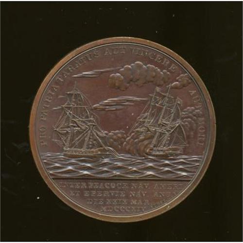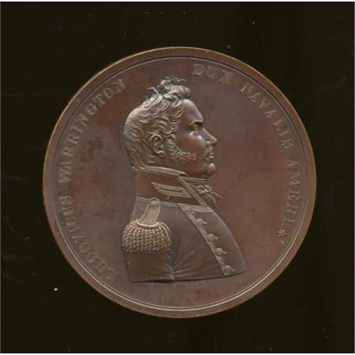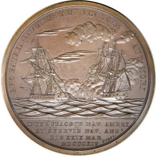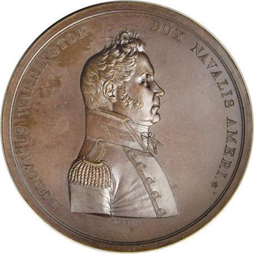 <B>Captain Lewis Warrington Naval Medal, Julian-NA-23, MS64 NGC.</B></I> Bronzed copper, 65 mm, 133.4 gm. Dies by Moritz Furst. Obverse bust right, legend around LUDOVICUS WARRINGTON DUX NAVALIS AMERI. ("Lewis Warrington, American naval commander"), FURST.F. below. (The second F is noticeably higher and out of line with the other letters.) Reverse legend around and in exergue PRO PATRIA PARATUS AUT VINCERE AUT MORI / INTER PEACOCK NAV. AMERI. ET EPERVIE NAV. ANG. DIE XXIX MAR. (sic) MDCCCXIV ("Ready to conquer or die for his country / Between the American vessel <I>Peacock </B></I>and the British ship <I>Epervier </B></I>March (sic) 29, 1814, FURST.F. to lower right (R broken at top [signifying an original reverse], second F again higher and out of line).<BR> Julian points out in <I>United States Mint Medals: The First Hundred Years 1792-1892 </B></I>that the actual date of the battle was April 29, 1814, adding that the original gold medal is on display at the United States Naval Academy Museum in Annapolis, Maryland. This lovely walnut-brown piece--yet another in this significant run of early U.S. naval medals from the War of 1812--shows glossy, problem-free surfaces with tinges of mint red around the peripheral legends and relatively few distractions. Complete with NGC Photo Certificate.<BR><BR><b>Shipping:</b> Coins & Currency (<a target="_blank" href="http://www.heritageauctions.com/common/shipping.php">view shipping information</a>)