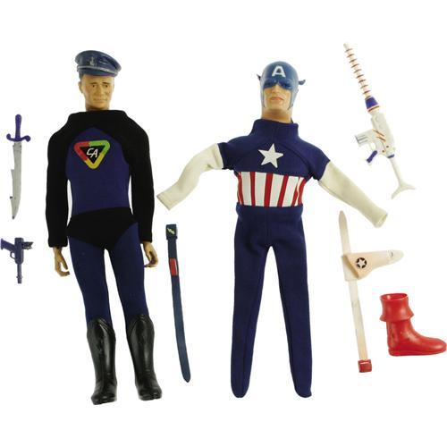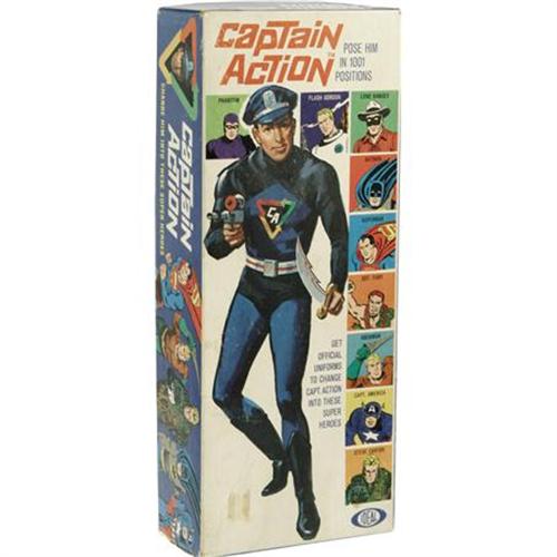 Here's the versatile Captain Action in his original box, complete with hat, belt, gun. and sword. The box is in nice condition with only some light scuffing and a bit of discoloration, and one corner split halfway up. Also included is a bonus Captain America outfit, "loose" with no box. The Star-Spangled Avenger comes complete with his belt and holster and his laser gun (yeah, Steve Rogers packed heat in the Captain Action world!). He's missing his shield, one boot, his ultrasonic pistol, and the ring that came with the set.<BR><BR><b>Shipping:</b> Small Collectibles (<a target="_blank" href="http://www.heritageauctions.com/common/shipping.php">view shipping information</a>)