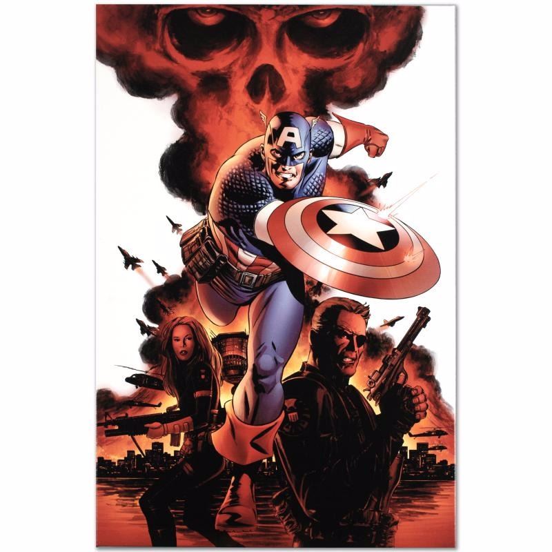 A piece of comic book history, this limited edition, from original art by Steve Epting, depicts an action packed scenes starring Captain America, Nick Fury and Black Widow. Steve Epting began working with Marvel Comics in the early 1990s; his first assignment was a six part Avengers series, thereafter he became a full time penciler on the Avengers. More recently Epting has been working on the Fantastic Four as well as Captain America. "Captain America #1" is a limited edition numbered giclee on stretched canvas by Steve Epting presented by Marvel Comics. This piece comes gallery wrapped and ready to hang. Includes Certificate of Authenticity! Measure approx. 18" x 27" (image); 1.5" (depth). Retail Price $500.00. PRICE INCUDES FREE SHIPPING IN THE U.S. - SHIPPING WILL BE ADDED TO YOUR INVOICE FOR ALL BUYERS OUTSIDE OF THE U.S.