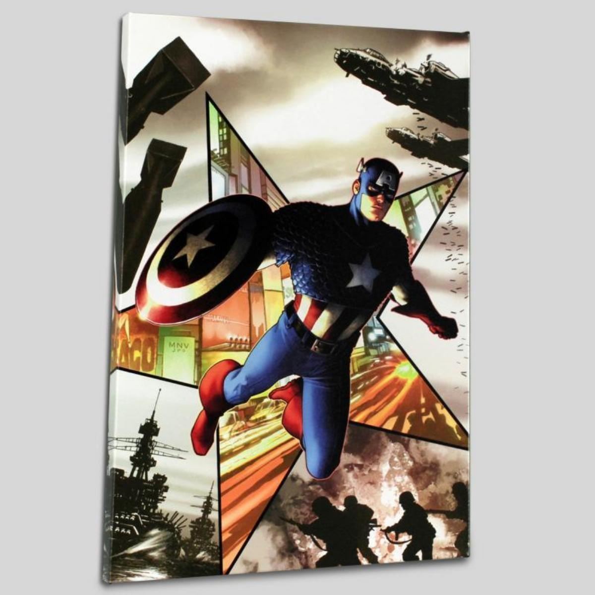 A piece of comic book history, this limited edition, from original art by Steve McNiven, depicts Captain America in action. Known for being the penciller of the Marvel mini-series "Civil War" Steve McNiven has also contributed art to Spider-Man and Wolverine, among others. "Captain America #1" is a limited edition numbered giclee on canvas by Steve McNiven presented by Marvel Comics. This piece comes gallery wrapped. Includes Certificate of Authenticity! Measures approx. 18" x 27" (image).