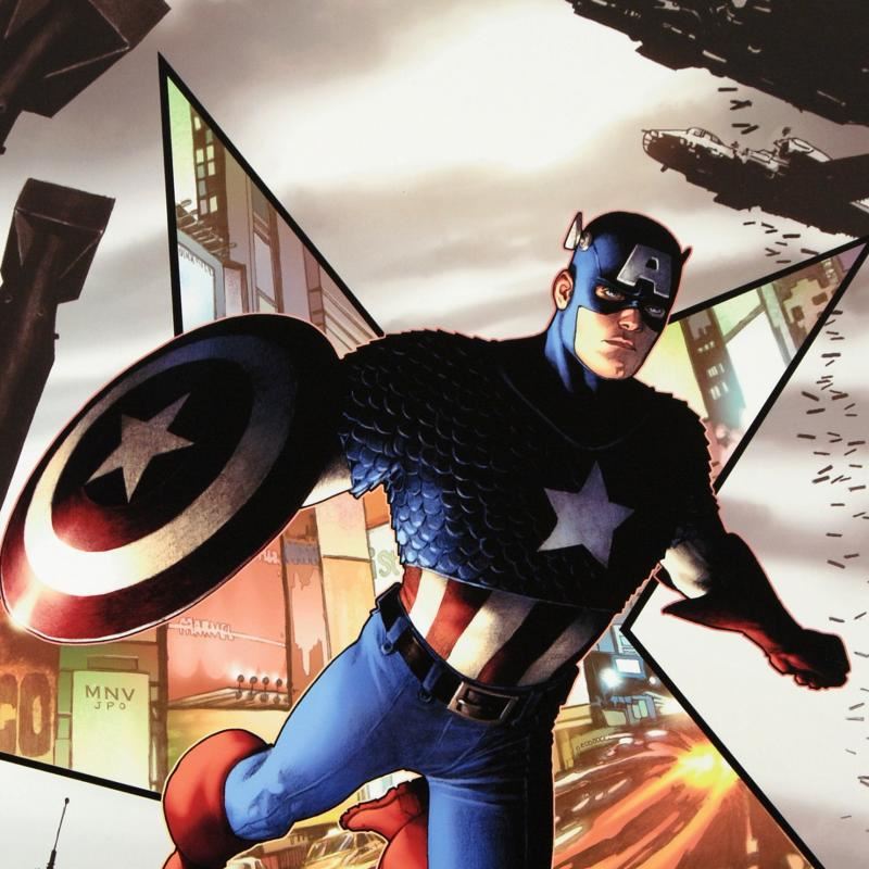A piece of comic book history, this limited edition, from original art by Steve McNiven, depicts Captain America in action. Known for being the penciller of the Marvel mini-series "Civil War" Steve McNiven has also contributed art to Spider-Man and Wolverine, among others. "Captain America #1" is a numbered limited edition giclee on canvas by Steve McNiven presented by Marvel Comics, hand signed by the great Stan Lee! Includes Certificate of Authenticity! Measures approx. 18" x 27" (image).