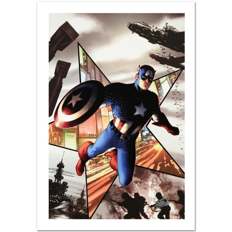 A piece of comic book history, this limited edition, from original art by Steve McNiven, depicts Captain America in action. Known for being the penciller of the Marvel mini-series "Civil War" Steve McNiven has also contributed art to Spider-Man and Wolverine, among others. "Captain America #1" is a numbered limited edition giclee on canvas by Steve McNiven presented by Marvel Comics, hand signed by the great Stan Lee! Includes Certificate of Authenticity! Measures approx. 18" x 27" (image).