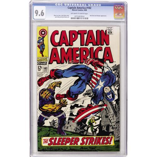 <B>Captain America #102 (Marvel, 1968) CGC NM+ 9.6 Off-white to white pages.</B></I> The Red Skull and the Sleeper appear. Jack Kirby cover and art. Overstreet 2006 NM- 9.2 value = $80. CGC census 3/07: 21 in 9.6, 1 higher.<BR><BR><b>Shipping:</b> Comics - Slabbed (certified) (<a target="_blank" href="http://www.heritageauctions.com/common/shipping.php">view shipping information</a>)
