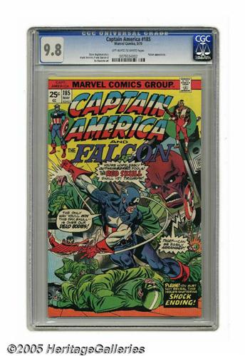 <B>Captain America #185 (Marvel, 1975) CGC NM/MT 9.8 Off-white to white pages.</B></I> Cap and the Falcon battle the Red Skull, and there's a revelation about the Falcon's origin. Two pages penciled by Sal Buscema, the rest by Frank Robbins. Gil Kane cover. Overstreet 2005 NM- 9.2 value = $8. CGC census 3/05: 2 in 9.8, none higher.