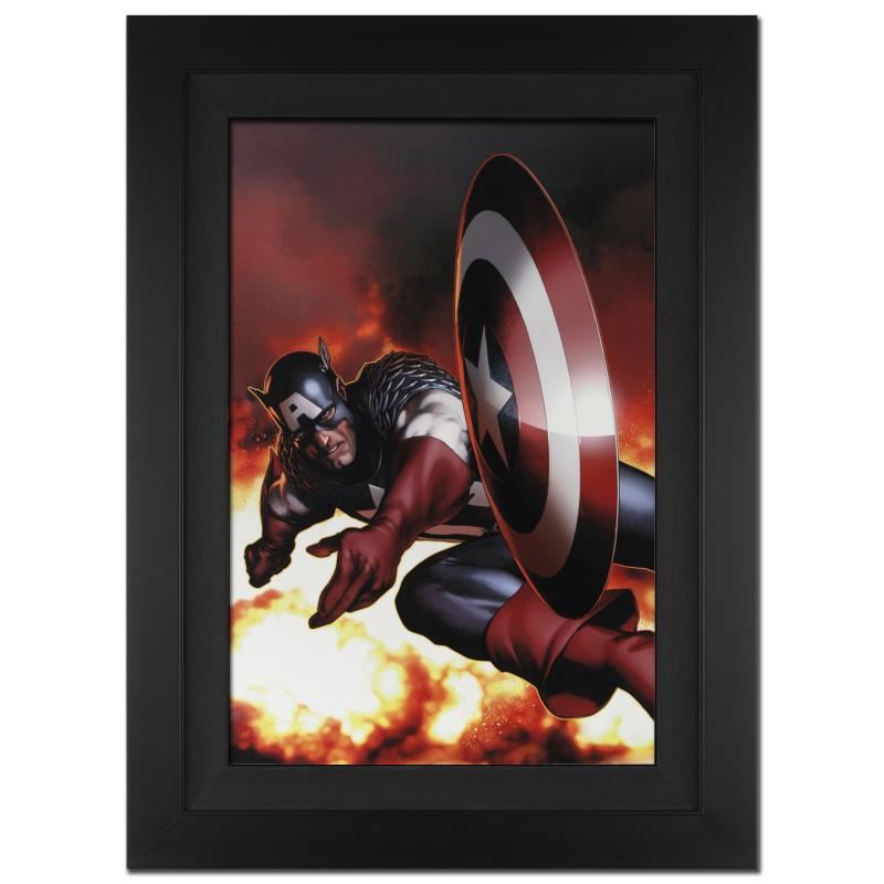 A piece of comic book history, this limited edition, from original art by Steve McNiven, depicts Captain America in action. Known for being the penciller of the Marvel mini-series "Civil War" Steve McNiven has also contributed art to Spider-Man and Wolverine, among others. "Captain America #2" is an extremely limited edition giclee on canvas by Steve McNiven presented by Marvel Comics, hand signed by the Great Stan Lee (1922-2018) and numbered out of only 10! This piece has been custom framed and ready to hang. Includes Certificate of Authenticity! Measure approx. 25" x 34" (with frame); 18" x 27" (image).