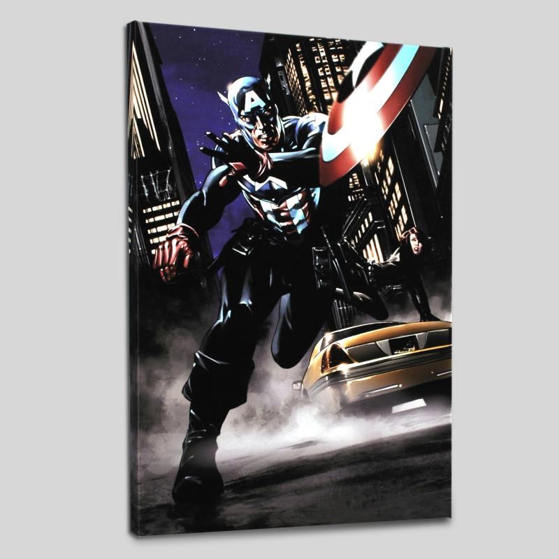 A piece of comic book history, this limited edition, from original art by Steve Epting, depicts an action packed scene starring Captain America. Steve Epting began working with Marvel Comics in the early 1990s; his first assignment was a six part Avengers series, thereafter he became a full time penciler on the Avengers. More recently Epting has been working on the Fantastic Four as well as Captain America. "Captain America #34" is a limited edition giclee on canvas by Steve Epting presented by Marvel Comics! This piece is gallery wrapped and ready to hang. Includes Certificate of Authenticity! Measures approx. 18" x 27" (image); 1.5" (depth).