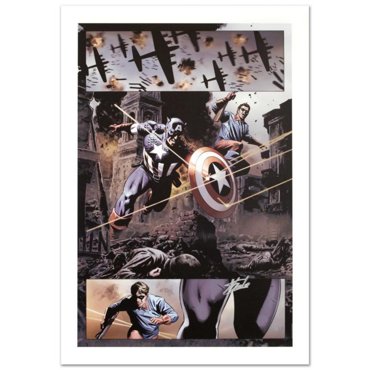 A piece of comic book history, this limited edition, from original art by Steve Epting, depicts an action packed scene starring Captain America and Bucky Barnes. Steve Epting began working with Marvel Comics in the early 1990s; his first assignment was a six part Avengers series, thereafter he became a full time penciler on the Avengers. More recently Epting has been working on the Fantastic Four as well as Captain America. "Captain America #37" is a limited edition giclee on canvas by Steve Epting presented by Marvel Comics, numbered and hand signed by the Great Stan Lee (1922-2018)! Includes Certificate of Authenticity! Measures approx. 18" x 27" (image). Reference #: 186745.
