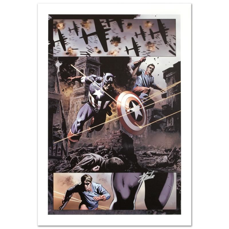 A piece of comic book history, this limited edition, from original art by Steve Epting, depicts an action packed scene starring Captain America and Bucky Barnes. Steve Epting began working with Marvel Comics in the early 1990s; his first assignment was a six part Avengers series, thereafter he became a full time penciler on the Avengers. More recently Epting has been working on the Fantastic Four as well as Captain America. "Captain America #37" is a limited edition giclee on canvas by Steve Epting presented by Marvel Comics, numbered and hand signed by the great Stan Lee! Includes Certificate of Authenticity! Measures approx. 18" x 27" (image).