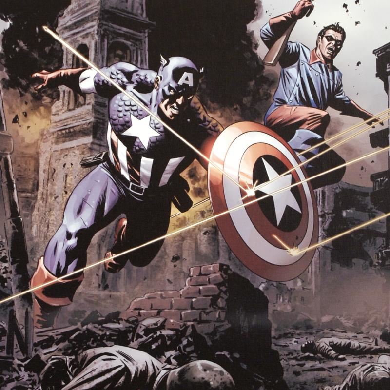 A piece of comic book history, this limited edition, from original art by Steve Epting, depicts an action packed scene starring Captain America and Bucky Barnes. Steve Epting began working with Marvel Comics in the early 1990s; his first assignment was a six part Avengers series, thereafter he became a full time penciler on the Avengers. More recently Epting has been working on the Fantastic Four as well as Captain America. "Captain America #37" is a limited edition giclee on canvas by Steve Epting presented by Marvel Comics, numbered and hand signed by the Great Stan Lee (1922-2018)! Includes Certificate of Authenticity! Measures approx. 18" x 27" (image).