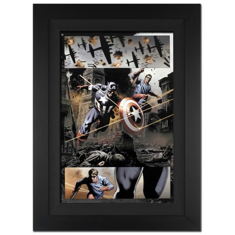 A piece of comic book history, this limited edition, from original art by Steve Epting, depicts an action packed scenes starring Captain America and Bucky Barnes. Steve Epting began working with Marvel Comics in the early 1990s; his first assignment was a six part Avengers series, thereafter he became a full time penciler on the Avengers. More recently Epting has been working on the Fantastic Four as well as Captain America. "Captain America #37" is an extremely limited edition giclee on canvas by Steve Epting presented by Marvel Comics, hand signed by the Great Stan Lee (1922-2018) and numbered out of only 10! This piece comes custom framed and ready to hang. Includes Certificate of Authenticity! Measures approx. 25" x 34" (with frame); 18" x 27" (image).