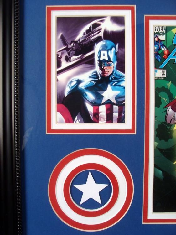 Here is a Captain America comic book and two pictures, all custom framed and matted. The issue is Marvel #4, from 1998, by the team of Waid Garney Wiacek. The cover features Captain America with an unusual different style shield. The two pictures portray other images of Captain America. Everything is triple matted in patriotic colors, with cool laser cut shields. The comic book is not graded, but it appears to be in near mint condition. The matte black frame is 22 3/4 x 18 3/4 inches * Proudly display this nicely framed piece on any wall.