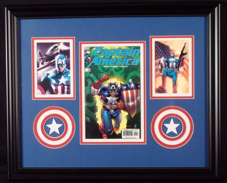 Here is a Captain America comic book and two pictures, all custom framed and matted. The issue is Marvel #4, from 1998, by the team of Waid Garney Wiacek. The cover features Captain America with an unusual different style shield. The two pictures portray other images of Captain America. Everything is triple matted in patriotic colors, with cool laser cut shields. The comic book is not graded, but it appears to be in near mint condition. The matte black frame is 22 3/4 x 18 3/4 inches * Proudly display this nicely framed piece on any wall.