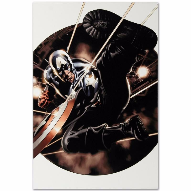 A piece of comic book history, this limited edition, from original art by Steve Epting, depicts an action packed scenes starring Captain America. Steve Epting began working with Marvel Comics in the early 1990s; his first assignment was a six part Avengers series, thereafter he became a full time penciler on the Avengers. More recently Epting has been working on the Fantastic Four as well as Captain America. "Captain America #41" is a limited edition giclee on canvas by Steve Epting presented by Marvel Comics! This piece comes gallery wrapped and ready to hang. Numbered, and includes Certificate of Authenticity! Measures approx. 18" x 27" (image); approx. 1.5" (depth). Retail Price $500.00. PRICE INCUDES FREE SHIPPING IN THE U.S. - SHIPPING WILL BE ADDED TO YOUR INVOICE FOR ALL BUYERS OUTSIDE OF THE U.S.