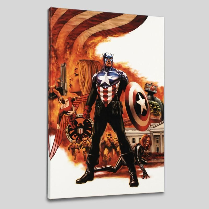 A piece of comic book history, this limited edition, from original art by Steve Epting, depicts a compilation scene starring Captain America. Steve Epting began working with Marvel Comics in the early 1990s; his first assignment was a six part Avengers series, thereafter he became a full time penciler on the Avengers. More recently Epting has been working on the Fantastic Four as well as Captain America. "Captain America #41" is a limited edition numbered giclee on stretched canvas by Steve Epting presented by Marvel Comics. This piece comes gallery wrapped. Includes Certificate of Authenticity! Measure approx. 18" x 27" (image), 1.5" (depth).