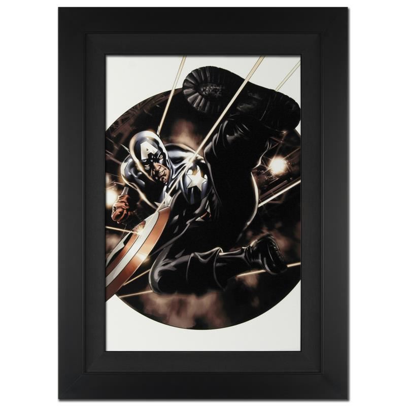A piece of comic book history, this limited edition, from original art by Steve Epting, depicts an action packed scenes starring Captain America. Steve Epting began working with Marvel Comics in the early 1990s; his first assignment was a six part Avengers series, thereafter he became a full time penciler on the Avengers. More recently Epting has been working on the Fantastic Four as well as Captain America. "Captain America #41" is an extremely limited edition giclee on canvas by Steve Epting presented by Marvel Comics, hand signed by the great Stan Lee and numbered out of only 10! This piece comes custom framed and ready to hang. Includes Certificate of Authenticity! Measures approx. 25" x 34" (with frame), 18" x 27" (image).