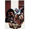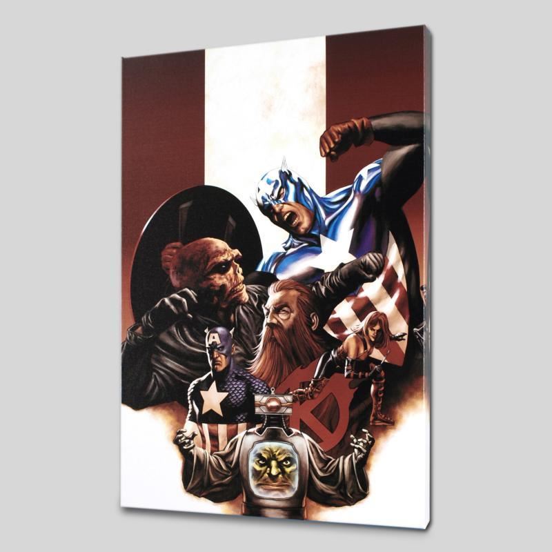 A piece of comic book history, this limited edition, from original art by Steve Epting, depicts an action packed scenes starring Captain America, Red Skull, Zola, Arnim. Steve Epting began working with Marvel Comics in the early 1990s; his first assignment was a six part Avengers series, thereafter he became a full time penciler on the Avengers. More recently Epting has been working on the Fantastic Four as well as Captain America. "Captain America #42" is a limited edition numbered giclee on stretched canvas by Steve Epting presented by Marvel Comics. This piece comes gallery wrapped. Includes Certificate of Authenticity! Measure approx. 18" x 27" (image); 1.5" (depth).