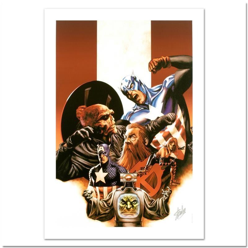 "Captain America #42" is a limited edition giclee on canvas with art by Steve Epting. Officially licensed by Marvel, this piece is numbered 4/99 and hand signed by creative legend Stan Lee (1922-2018). The piece comes with a certificate of authenticity. Measures approximately 27" x 18".