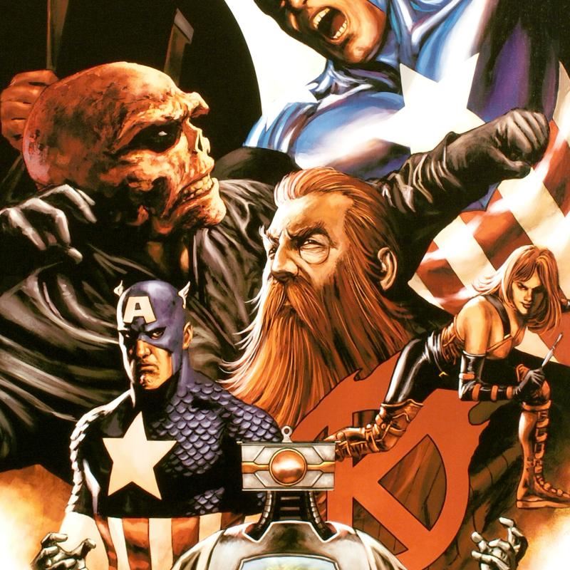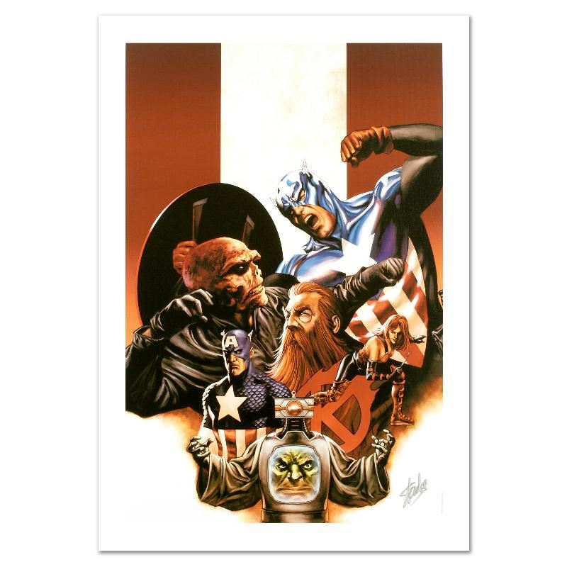 A piece of comic book history, this limited edition, from original art by Steve Epting, depicts an action packed scenes starring Captain America, Red Skull, Zola, Arnim. Steve Epting began working with Marvel Comics in the early 1990s; his first assignment was a six part Avengers series, thereafter he became a full time penciler on the Avengers. More recently Epting has been working on the Fantastic Four as well as Captain America. "Captain America #42" is limited edition giclee on canvas by Steve Epting presented by Marvel Comics, numbered and hand signed by the great Stan Lee! Includes Certificate of Authenticity! Measures approx. 18" x 27" (image).
