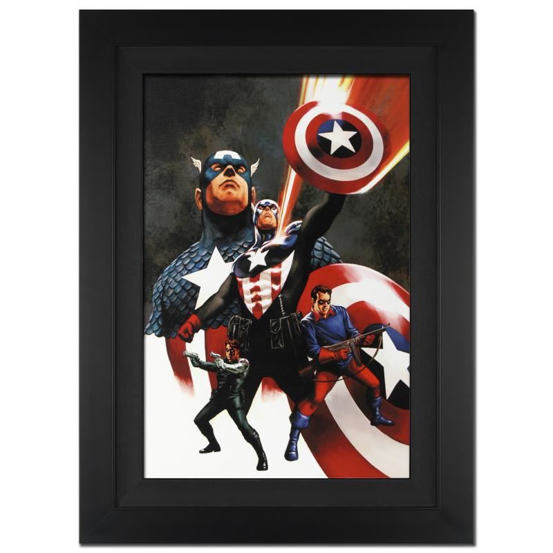 A piece of comic book history, this limited edition, from original art by Steve Epting, depicts a homage Captain America and his pal Bucky. Steve Epting began working with Marvel Comics in the early 1990s; his first assignment was a six part Avengers series, thereafter he became a full time penciler on the Avengers. More recently Epting has been working on the Fantastic Four as well as Captain America. "Captain America #600" is an extremely limited edition giclee on canvas by Steve Epting presented by Marvel Comics, hand signed by the Great Stan Lee (1922-2018) and numbered out of only 4! This piece comes custom framed and ready to hang. Includes Certificate of Authenticity! Measure approx. 29" x 40" (with frame), 22" x 33" (image).