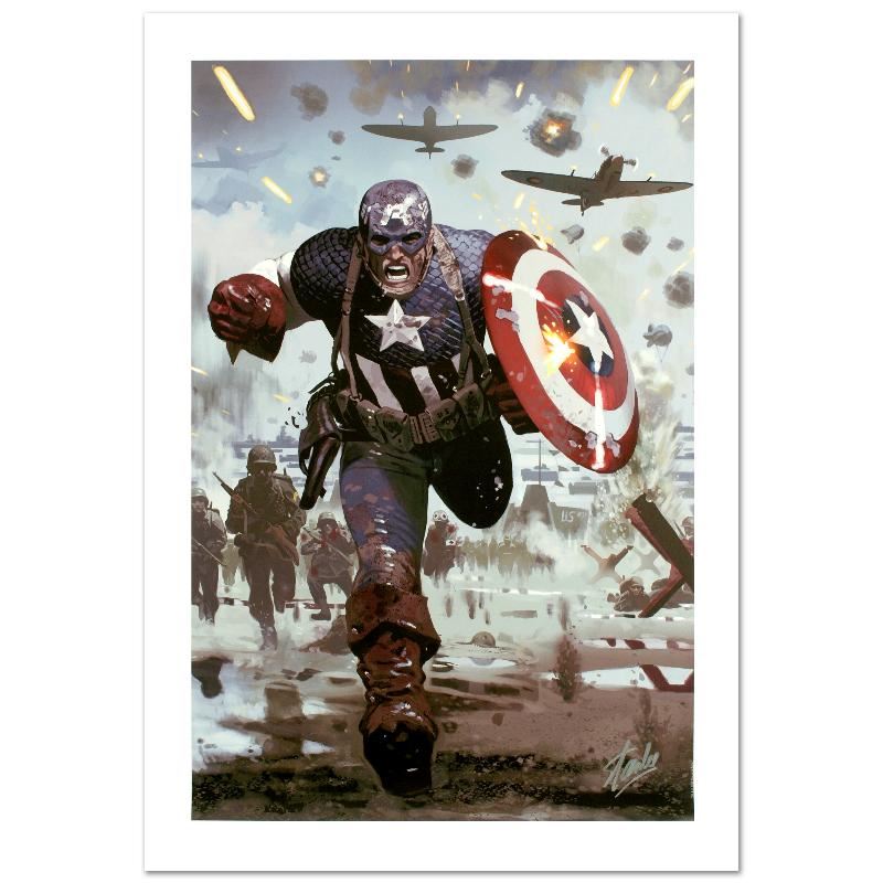A piece of comic book history, this limited edition, from original art by Daniel Acuna, depicts the heroic Captain America. Spanish artist Daniel Acuna cites artists like Jack Kirby and Simon Bisley as his early artist influences. After doing some occasional cover art for Marvel, Acuna signed an exclusive contract with Marvel in 2007. "Captain America #615" is a limited edition giclee on canvas by Daniel Acuna presented by Marvel Comics, numbered and hand signed by the great Stan Lee! Includes Certificate of Authenticity! Measures approx. 18" x 27" (image).