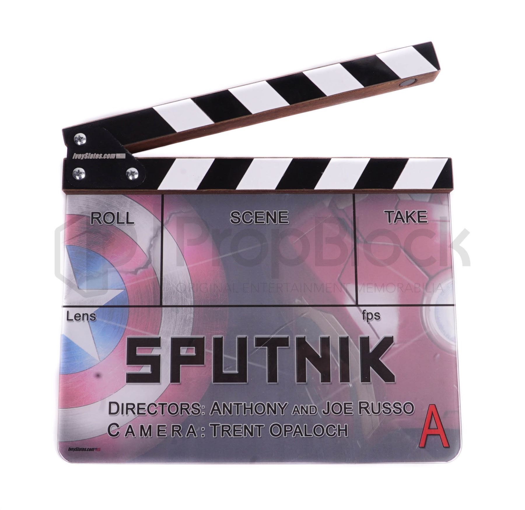 Clapperboard given out to select members of the cast and crew after filming of the Marvel superhero film Captain America The Winter Soldier. This crew clapperboard features a white acrylic slate featuring the films codename along with information such as the director and DP. The clapper features a wooden black and white clapper on the top. This item remains in excellent, production made condition.