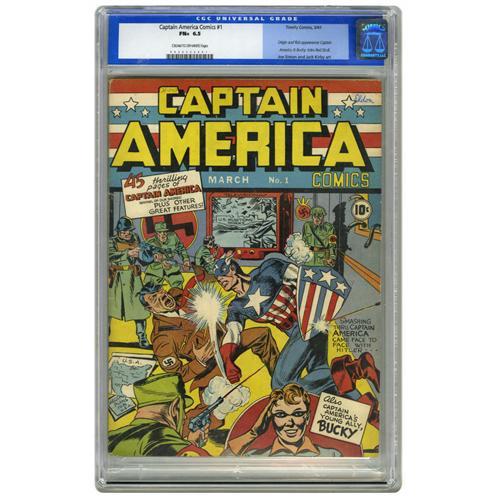 <B>Captain America Comics #1 (Timely, 1941) CGC FN+ 6.5 Cream to off-white pages.</B></I> The origin and first appearance of Captain America, this is one of the ten most valuable comic books in Overstreet's ranking, and it brings together everything you could ask for. It was a groundbreaking book: though Cap wasn't the first patriotic hero, he was the best of the bunch thanks to the fantastic visuals of Joe Simon and Jack Kirby. The cover with Cap punching Hitler came months before the USA entered the war, and at a time when most comics were referring to the Nazi menace in an oblique fashion if at all. Then there's the fact that Cap's most memorable villain, the Red Skull, first appeared in the issue, as did Cap's sidekick Bucky. Simply a must for any Timely/Marvel collector! Overstreet 2006 FN 6.0 value = $21,950; VF 8.0 value = $51,000. CGC census 3/06: 4 in 6.5, 11 higher.