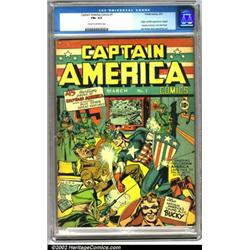Captain America Comics #1 (Timely, 1941). With a devastating right hook, Captain America brings the world of Timely Comics into World War II, as he pastes one on old Adolf himself! Released almost a full year before the attack on Pearl Harbor, Timely set themselves in the reality-based world of Axis and Allies, and set the tone that they would take until well after the war's finish in 1945. One of the most important books of the Golden Age of comics, this is a solid mid-grade copy. There are some erasure marks across the logo as well as a few imperfections along the spine. This is a sharp, clean copy of a perennially desirable comic. CGC FN+ 6.5 Cream to off-white pages. Overstreet 2001 FN 6.0 value = $17,100; VF 8.0 value = $39,900. Important notice: We expect to be auctioning lots at the rate of 200-250 per hour. Sometimes eBay Premier live bid software cannot keep up with that pace, so we strongly recommend that you place a realistic proxy bid now as insurance to avoid disappointment. Also please note that all Heritage/CAA lots purchased through eBay Premier carry a 20% Buyer's Premium.