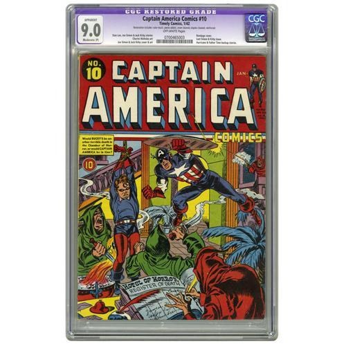 <B>Captain America Comics #10 (Timely, 1942) CGC Apparent VF/NM 9.0 Moderate (P) Off-white pages.</B></I> Simon and Kirby wrapped up their commitment for <B>Captain America</B></I> with this fast-paced issue, which featured some of the best stories of their ten-issue run. We here at Heritage see many a restored Golden Age book pass through our halls, but few match the expert work applied to this copy. CGC notes, "Restoration includes: color touch, pieces added, cover cleaned, staples cleaned, reinforced." Overstreet 2006 GD 2.0 value = $448; VG 4.0 value = $896; FN 6.0 value = $1,344; VF 8.0 value = $3,136; VF/NM 9.0 value = $5,268.