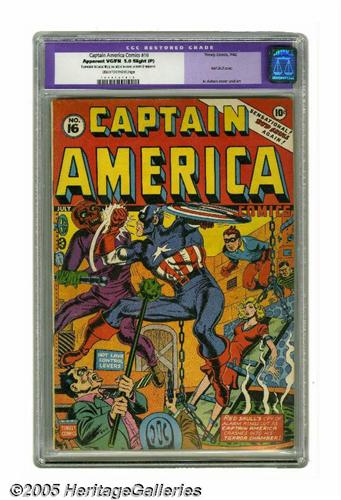 <B>Captain America Comics #16 (Timely, 1942) CGC Apparent VG/FN 5.0 Slight (P) Cream to off-white pages.</B></I> The Red Skull unmasks Cap and finds out that he's really Steve Rogers, in one of the most exciting stories of this series' run! Not only that, the Red Skull is seen without his mask (not by Cap, but by us readers) in the story, which was written by Stan Lee and drawn by Al Avison. The cover is by Avison. CGC notes, "Restoration includes: tiny piece added to cover, centerfold reinforced." Overstreet 2005 GD 2.0 value = $423; VG 4.0 value = $846; FN 6.0 value = $1,269.