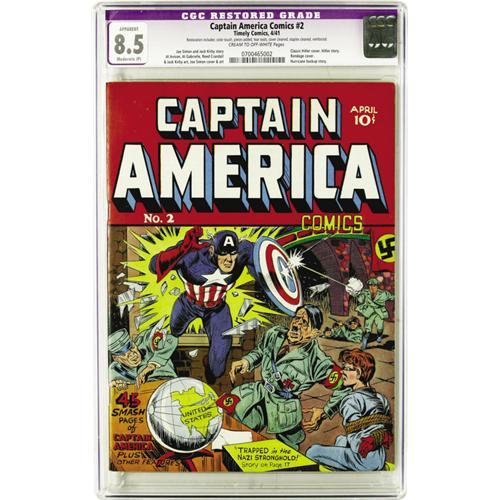 <B>Captain America Comics #2 (Timely, 1941) CGC Apparent VF+ 8.5 Moderate (P) Cream to off-white pages.</B></I> In terms of sheer looks, this is the nicest copy of #2 that we've ever laid eyes upon. High-grade <I>un</B></I>restored copies are scarce if they exist at all (the best blue-label book in CGC's census is an 8.5), so if you want to know what it felt like to see this book when it first appeared, this professionally restored copy presents a perfect opportunity. The issue has the first appearance of Captain America's round shield, which was the only one he used from that day forward. Adolf Hitler appeared on his second cover in a row, with Joe Simon handling the art this time. The book's interior artists include Simon, Jack Kirby, and Reed Crandall. Hitler's back inside the book, joined by Hermann Goering for a four-way showdown with Cap and Bucky! Overstreet 2006 GD 2.0 value = $1,278; VG 4.0 value $2,556; FN 6.0 value = $3,834; VF 8.0 value = $9,585; VF/NM 9.0 value = $16,293. <BR><BR><B>Important notice:</B> Heritage usually auctions material at the rate of 200-250 lots per hour. On some occasions eBay Live bid software or the Internet may not be able to keep up with the pace of the auction. We recommend placing a realistic absentee bid now as insurance to avoid disappointment. Occasionally the auctioneer may eliminate or reject an eBay Live bid, and the auctioneer may also reopen a lot after the close of the eBay live bidding (usually because we missed an audience bid), and may reject your bid even if it shows you as the winning bidder. By bidding via eBay Live, you agree that Heritage may award the lot to another bidder at its sole discretion under the circumstances described above or any other reasonable circumstances. Since eBay bids are not shown to us until we open the lot on the floor, we treat those bids just like floor bids. In most cases the floor responds before the eBay bid is presented to us, due to Internet lag time, so for consistency we have made it a policy that floor bids are always considered first over tie eBay live bids. Also please note that all Heritage lots purchased through eBay Live carry a 22.5% Buyer's Premium. Please make sure you read the Terms and Conditions before you bid. This lot is being auctioned in conjunction with a live floor auction by Heritage Auction Galleries. All final auction and invoice information will be supplied by Heritage Auction Galleries, and all other information should be considered preliminary. Lot:41001 <BR><BR><B>Winning Notification and Billing:</B> After the FINAL session in this auction is complete, Heritage will send e-mail and snail mail invoices. This process normally takes several days. All final auction and invoice information will be supplied by Heritage Auction Galleries, and all other information should be considered preliminary. <BR><BR>This auction will be conducted on a live auction floor and over the Internet through eBay Live. If you choose to place an absentee bid, please take a moment to <font color='#0000ff'><u><a href='http://pages.ebay.com/liveauctions/help/before/laabsentee.html'>learn how eBay Live absentee bidding works</a></u></font><font color='#000000'>