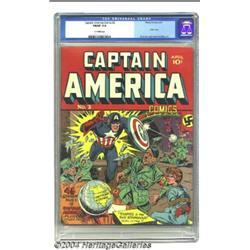 Captain America Comics #2 (Timely, 1941) CGC FN/VF Off-white pages. Adolf returns for his second consecutive cover appearance in the fledgling title, this time picking on poor, bondaged Bucky. After the imminent pummeling, you can bet Adolph won't bug Cap on the cover of issue #3! Creator Jack Kirby rates a "classic cover" by Overstreet for this over-the-top scene, while on the interior he teams up with buddy Joe Simon and shares space with Al Avison. This issue is harder to find in high grade than the premiere issue of the title. Just three unrestored copies have received higher grades from CGC to date, the highest at VF+ 8.5. From the front, the book looks to be a higher grade, but does display a bindery cut at the bottom of the spine. From the back, a slight spine roll is evident, keeping the book at the still relatively high grade (for this issue) of FN/VF 7.0. Overstreet 2003 FN 6.0 value = $3,400; VF 8.0 value = $8,500. Important notice: Heritage usually auctions material at the rate of 200-250 lots per hour. On some occasions eBay Live bid software or the Internet may not be able to keep up with the pace of the auction. We recommend placing a realistic absentee bid now as insurance to avoid disappointment. Occasionally the auctioneer may eliminate or reject an eBay Live bid, and the auctioneer may also reopen a lot after the close of the eBay live bidding (usually because we missed an audience bid), and may reject your bid even if it shows you as the winning bidder. By bidding via eBay Live, you agree that Heritage may award the lot to another bidder at its sole discretion under the circumstances described above or any other reasonable circumstances. Since eBay bids are not shown to us until we open the lot on the floor, we treat those bids just like floor bids. In most cases the floor responds before the eBay bid is presented to us, due to Internet lag time, so for consistency we have made it a policy that floor bids are always considered first over tie eBay live bids. Also please note that all Heritage lots purchased through eBay Live carry a 20% Buyer's Premium. Please make sure you read the Terms and Conditions before you bid.