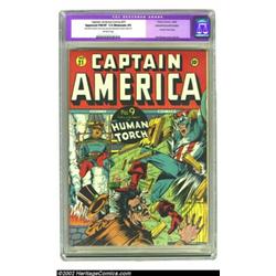 Captain America Comics #21 (Timely, 1942) CGC Apparent FN/VF 7.0 Moderate (P) Off-white pages. Syd Shores' cover highlights a copy whose "Apparent" grade ranks with the nicest copy that CGC has yet certified, and only three unrestored copies have been graded by CGC to date. CGC notes, "Restoration includes: color touch, tear seals, split sealed, cleaned, reinforced. Centerfold detached." The issue includes a Human Torch story. Overstreet 2002 FN 6.0 value = $681; VF 8.0 value = $1,420. Important notice: We expect to be auctioning lots at the rate of 200-250 per hour. Sometimes eBay Premier live bid software cannot keep up with that pace, so we strongly recommend that you place a realistic proxy bid now as insurance to avoid disappointment. Also please note that all Heritage/CAA lots purchased through eBay Premier carry a 20% Buyer's Premium. Please make sure you read the Terms and Conditions.