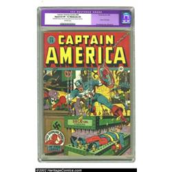 Captain America Comics #28 (Timely, 1943) CGC Apparent VF- 7.5 Moderate (P) Off-white pages. Another torture chamber, another maniacal Nazi sadist, another time for Cap to arrive just in the nick of time to rescue Bucky from a gruesome fate, just another great cover from the mind and pen of Alex Schomburg. Three unrestored copies of the issue have scored grades from CGC as high as 7.5, meaning on looks alone this copy really stands out. CGC notes "Restoration includes: color touch, piece added, tear seal, cleaned, reinforced." Overstreet 2002 VF 8.0 value = $1,338. Important notice: We expect to be auctioning lots at the rate of 200-250 per hour. Sometimes eBay Premier live bid software cannot keep up with that pace, so we strongly recommend that you place a realistic proxy bid now as insurance to avoid disappointment. Also please note that all Heritage/CAA lots purchased through eBay Premier carry a 20% Buyer's Premium. Please make sure you read the Terms and Conditions.