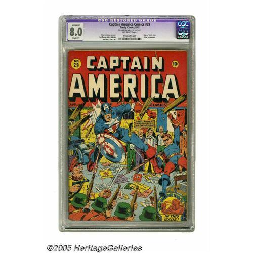 <B>Captain America Comics #29 (Timely, 1943) CGC Apparent VF 8.0 Slight (P) Off-white pages.</B></I> Cap and Bucky come to the aid of the French Resistance on this stirring World War II cover by Alex Schomburg. Inside, the Human Torch shares space with none other than Adolph Hitler himself! This copy looks clean and sharp; it's from the ""single staple"" era, and this is where the minor restoration work has been done. CGC notes, ""Restoration includes: cover reinforced."" Overstreet 2005 GD 2.0 value = $246; VG 4.0 value = $492; FN 6.0 value = $738; VF 8.0 value = $1,538. <BR><BR><B>Important notice:</B> Heritage usually auctions material at the rate of 200-250 lots per hour. On some occasions eBay Live bid software or the Internet may not be able to keep up with the pace of the auction. We recommend placing a realistic absentee bid now as insurance to avoid disappointment. Occasionally the auctioneer may eliminate or reject an eBay Live bid, and the auctioneer may also reopen a lot after the close of the eBay live bidding (usually because we missed an audience bid), and may reject your bid even if it shows you as the winning bidder. By bidding via eBay Live, you agree that Heritage may award the lot to another bidder at its sole discretion under the circumstances described above or any other reasonable circumstances. Since eBay bids are not shown to us until we open the lot on the floor, we treat those bids just like floor bids. In most cases the floor responds before the eBay bid is presented to us, due to Internet lag time, so for consistency we have made it a policy that floor bids are always considered first over tie eBay live bids. Also please note that all Heritage lots purchased through eBay Live carry a 20% Buyer's Premium. Please make sure you read the Terms and Conditions before you bid. This lot is being auctioned in conjunction with a live floor auction by Heritage Galleries & Auctioneers. All final auction and invoice information will be supplied by He