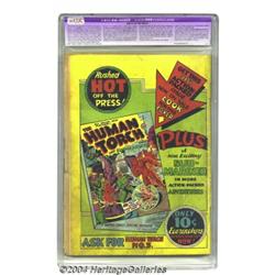 <B>Captain America Comics #3 (Timely, 1941) CGC Apparent GD 2.0 Slight (A) Off-white pages.</B></I> Here's your chance to grab a piece of Timely (and comic book) history for less than the five figures that top-grade copies of the book have been known to change hands for. The book is from the Simon and Kirby run on the title (which only lasted ten issues). Two of Timely's other top names were involved as well: Alex Schomburg (who drew the classic cover depicting the Red Skull) and a very young Stan Lee (in fact, his very first published work is seen here, it's the text feature "Captain America Foils the Traitor's Revenge"). CGC notes, "Restoration includes: spine split sealed, cover reinforced with glue. (Small piece out last page, slightly affects story)." Overstreet 2004 GD 2.0 value = $1,069. <BR><BR><B>Important notice:</B> Heritage usually auctions material at the rate of 200-250 lots per hour. On some occasions eBay Live bid software or the Internet may not be able to keep up with the pace of the auction. We recommend placing a realistic absentee bid now as insurance to avoid disappointment. Occasionally the auctioneer may eliminate or reject an eBay Live bid, and the auctioneer may also reopen a lot after the close of the eBay live bidding (usually because we missed an audience bid), and may reject your bid even if it shows you as the winning bidder. By bidding via eBay Live, you agree that Heritage may award the lot to another bidder at its sole discretion under the circumstances described above or any other reasonable circumstances. Since eBay bids are not shown to us until we open the lot on the floor, we treat those bids just like floor bids. In most cases the floor responds before the eBay bid is presented to us, due to Internet lag time, so for consistency we have made it a policy that floor bids are always considered first over tie eBay live bids. Also please note that all Heritage lots purchased through eBay Live carry a 20% Buyer's Premium. Please make sure you read the Terms and Conditions before you bid.