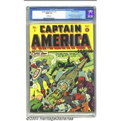Captain America Comics #3 (Timely, 1941) CGC FN/VF 7.0 Off-white pages. This third issue is famous for several reasons; it's one of our favorites here at Heritage because it contains the very first Timely work by our buddy Stan Lee. It also has a stunning cover by Alex Schomburg, replete with a blonde that is not only bound, but in one of the famous clear tubes that everyone seemed enamored with in the early Golden Age. This cover is also considered a "classic," featuring Cap's arch-nemesis, the Red Skull, and a striking yellow background for the logo. Overstreet 2003 FN 6.0 value = $3,000; VF 8.0 value = $7,000. Important notice: Heritage usually auctions material at the rate of 200-250 lots per hour. On some occasions eBay Live bid software or the Internet may not be able to keep up with the pace of the auction. We recommend placing a realistic absentee bid now as insurance to avoid disappointment. Occasionally the auctioneer may eliminate or reject an eBay Live bid, and the auctioneer may also reopen a lot after the close of the eBay live bidding (usually because we missed an audience bid), and may reject your bid even if it shows you as the winning bidder. By bidding via eBay Live, you agree that Heritage may award the lot to another bidder at its sole discretion under the circumstances described above or any other reasonable circumstances. Since eBay bids are not shown to us until we open the lot on the floor, we treat those bids just like floor bids. In most cases the floor responds before the eBay bid is presented to us, due to Internet lag time, so for consistency we have made it a policy that floor bids are always considered first over tie eBay live bids. Also please note that all Heritage lots purchased through eBay Live carry a 20% Buyer's Premium. Please make sure you read the Terms and Conditions before you bid.