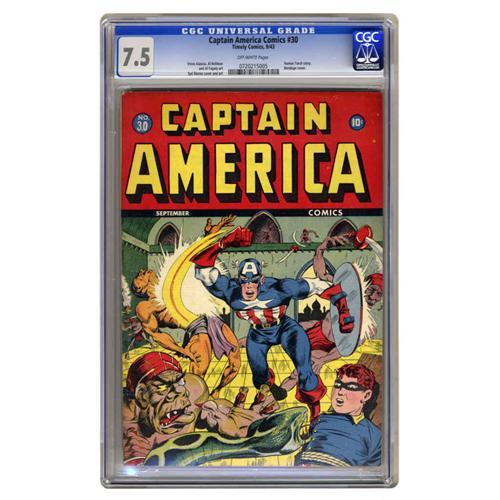 <B>Captain America Comics #30 (Timely, 1943) CGC VF- 7.5 Off-white pages.</B></I> When eye-catching action was needed, Syd Shores was one of Timely's go-to guys. Shores also provided interior art for the issue, as did Vince Alascia, Al Bellman, and Al Fagaly. The Human Torch heats up a backup feature. Overstreet 2005 VF 8.0 value = $1,538. CGC census 11/05: 2 in 7.5, 7 higher.