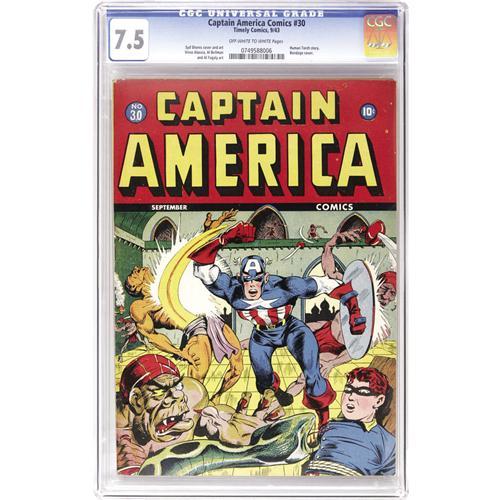 <B>Captain America Comics #30 (Timely, 1943) CGC VF- 7.5 Off-white to white pages.</B></I> Syd Shores does his best Alex Schomburg imitation on this action-packed cover. That snake menacing a trussed-up Bucky looks pretty darn scary! Inside, the Human Torch is featured in a back-up story. A couple of small spots on the lower spine area suggest a slight bit of moisture damage; otherwise, this copy looks pretty sound and sharp. Overstreet 2006 VF 8.0 value = $1,619. CGC census 10/06: 2 in 7.5, 7 higher.<BR><BR><b>Shipping:</b> Slabbed Comic (<a target="_blank" href="http://www.heritageauctions.com/common/shipping.php">view shipping information</a>)