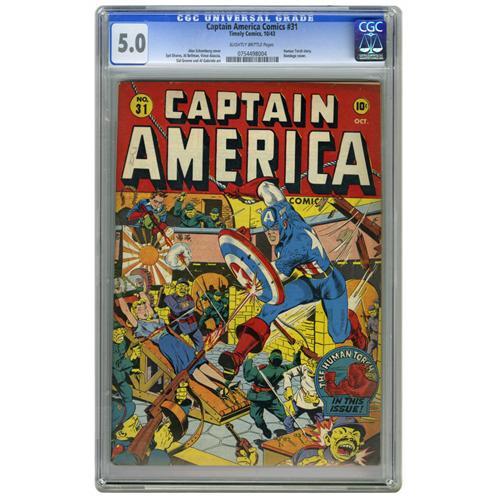 <B>Captain America Comics #31 (Timely, 1943) CGC VG/FN 5.0 Slightly brittle pages.</B></I> There's bargain potential here! This is a great-looking copy of an issue with a fantastic bondage cover by Alex Schomburg. The modest grade is evidently due to the low page quality, but if like many collectors you collect these Timely books for the great Schomburg covers, this one will be pure enjoyment. Note that a small plastic stabilizing peg is loose inside the CGC holder, not affecting the comic itself or the integrity of the holder. Overstreet 2006 VG 4.0 value = $444; FN 6.0 value = $666. CGC census 4/06: 2 in 5.0, 12 higher.