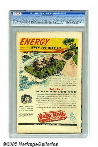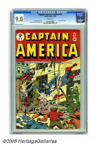 <B>Captain America Comics #42 (Timely, 1944) CGC VF/NM 9.0 White pages.</B></I> No copy of this issue has been graded higher by CGC to date. The book boasts an Alex Schomburg cover, and inside is a Human Torch story in addition to multiple Cap features. Overstreet 2005 VF/NM 9.0 value = $1,741; NM- 9.2 value = $2,350. CGC census 6/05: 2 in 9.0, none higher.