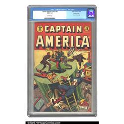 Captain America Comics #43 Crowley pedigree (Timely, 1944) CGC NM- 9.2 Off-white pages. The last Nazi war cover was just a few issues away, but the theme was still going strong in this issue, which also features The Human Torch. This Crowley copy currently ranks as the finest that CGC has certified of issue #43. Overstreet 2002 NM 9.4 value = $1,800. Important notice: We expect to be auctioning lots at the rate of 200-250 per hour. Sometimes eBay Premier live bid software cannot keep up with that pace, so we strongly recommend that you place a realistic proxy bid now as insurance to avoid disappointment. Also please note that all Heritage/CAA lots purchased through eBay Premier carry a 20% Buyer's Premium. Please make sure you read the Terms and Conditions.