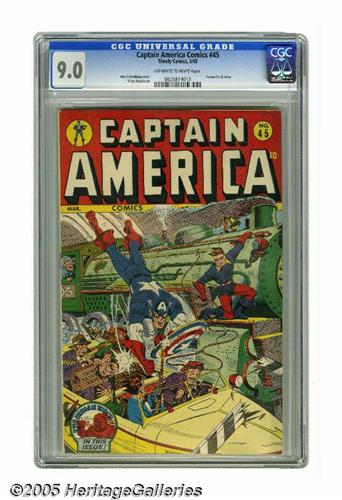 <B>Captain America Comics #45 (Timely, 1945) CGC VF/NM 9.0 Off-white to white pages.</B></I> Alex Schomburg's action-fest of a cover is complemented by this excellent copy, the second highest-graded to be certified by CGC to date for issue #45. Overstreet 2005 VF/NM 9.0 value = $1,741; NM- 9.2 value = $2,350. CGC census 6/05: 1 in 9.0, 1 higher.