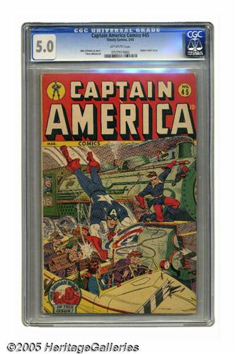 <B>Captain America Comics #45 (Timely, 1945) CGC VG/FN 5.0 Off-white pages.</B></I> All aboard the Alex Schomburg express! Passengers Cap and Bucky star in several adventures inside the comic, and there's also a Human Torch story. Overstreet 2005 VG 4.0 value = $362; FN 6.0 value = $543. CGC census 5/05: 2 in 5.0, 7 higher.