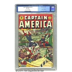 Captain America Comics #45 (Timely, 1945) CGC VF+ 8.5 Off-white to white pages. Action is what Alex Schomburg Cap covers are all about, and this one makes pupils dilate to take it all in. Very little keeps this from Near Mint territory, certainly not the blinding colors, so vibrant one can't help wondering why the fresh paint doesn't smear on CGC's hard case. This is the real deal, a superbly preserved copy of a perennial favorite. The Human Torch appears inside. There are currently only three copies of this issue that have been graded higher by CGC, and one of those received a "Qualified" grade. Overstreet 2003 VF 8.0 value = $1,063; VF/NM 9.0 value = $1,507. Important notice: Heritage usually auctions material at the rate of 200-250 lots per hour. On some occasions eBay Live bid software or the Internet may not be able to keep up with the pace of the auction. We recommend placing a realistic absentee bid now as insurance to avoid disappointment. Occasionally the auctioneer may eliminate or reject an eBay Live bid, and the auctioneer may also reopen a lot after the close of the eBay live bidding (usually because we missed an audience bid), and may reject your bid even if it shows you as the winning bidder. By bidding via eBay Live, you agree that Heritage may award the lot to another bidder at its sole discretion under the circumstances described above or any other reasonable circumstances. Since eBay bids are not shown to us until we open the lot on the floor, we treat those bids just like floor bids. In most cases the floor responds before the eBay bid is presented to us, due to Internet lag time, so for consistency we have made it a policy that floor bids are always considered first over tie eBay live bids. Also please note that all Heritage lots purchased through eBay Live carry a 20% Buyer's Premium. Please make sure you read the Terms and Conditions before you bid.