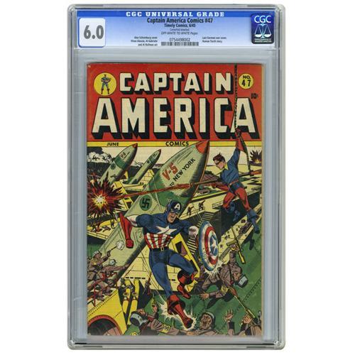 <B>Captain America Comics #47 (Timely, 1945) CGC FN 6.0 Off-white to white pages.</B></I> This Alex Schomburg effort was the last German war cover of this series. In addition to the Captain America tales, the Human Torch appears in a backup feature. CGC notes, "Centerfold detached." Overstreet 2006 FN 6.0 value = $579. CGC census 4/06: 1 in 6.0, 8 higher.