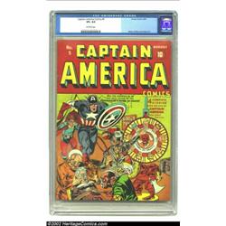 Captain America Comics #5 (Timely, 1941) CGC VF+ 8.5 Off-white pages. Jack Kirby was most adept at portraying scenes of grotesque Nazi characters committing vile acts of torture in dens, dungeons, pits, caves, and the like. Here King Kirby pencils and Syd Shores inks a morbidly enticing cover that's pure WWII Timely. Feast your eyes upon the nicest copy of issue #5 listed in CGC's most recent census, then bid on one of the auction's true prizes. Overstreet 2002 VF 8.0 value = $3,500; NM 9.4 value = $7,000. Important notice: We expect to be auctioning lots at the rate of 200-250 per hour. Sometimes eBay Premier live bid software cannot keep up with that pace, so we strongly recommend that you place a realistic proxy bid now as insurance to avoid disappointment. Also please note that all Heritage/CAA lots purchased through eBay Premier carry a 20% Buyer's Premium. Please make sure you read the Terms and Conditions.