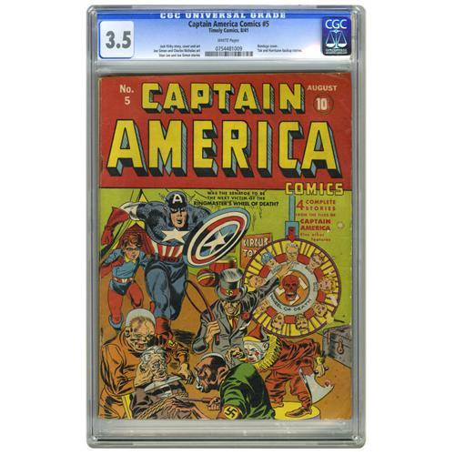 <B>Captain America Comics #5 (Timely, 1941) CGC VG- 3.5 White pages.</B></I> This Simon and Kirby cover delivers all the thrills you need -- where other artists might be content with <I>one</B></I> scary fiend, S & K conjured up <I>four</B></I>, and we're not even counting the Red Skull's picture on the "wheel of death!" Silver Age fans will recognize the villainous Ringmaster, who'd be back come the 1960s. Overstreet 2006 VG 4.0 value = $1,334. CGC census 4/06: 1 in 3.5, 18 higher.