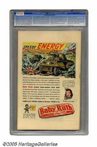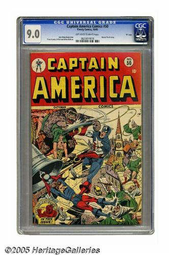 <B>Captain America Comics #50 "D" Copy pedigree (Timely, 1945) CGC VF/NM 9.0 Off-white to white pages.</B></I> This pedigree copy is outgraded by only one copy in CGC's census (and that one's just one notch higher at 9.2). This Alex Schomburg cover offers a different setting than usual, as an unnamed European village plays host to a gorilla... and of course the usual hooded goons. Vince Alascia drew Cap inside the issue; there's also a Human Torch backup feature. Overstreet 2005 VF/NM 9.0 value = $1,332; NM- 9.2 value = $1,800. CGC census 7/05: 1 in 9.0, 1 higher.
